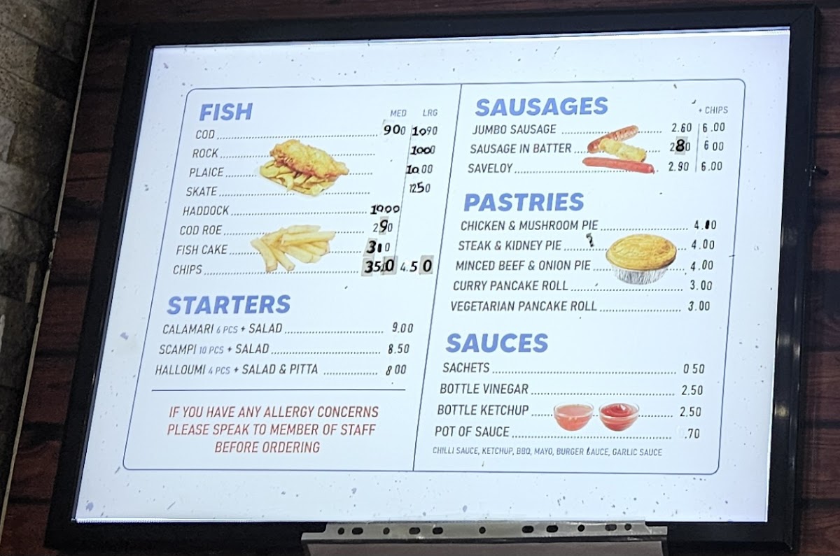 The menu features a variety of fish like cod, plaice, and skate, alongside delicious sides such as expertly cooked chips and tempting starters like calamari and scampi. For those with heartier appetites, the jumbo sausage and chicken burgers provide satisfying options. Customers appreciate the value and variety available, from set meal deals to a la carte orders.